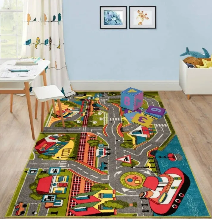 Designul covorului include un labirint de drumuri interconectate, care formează un mic oraș sau o comunitate. Drumurile sunt marcate cu linii albe clare, asemănătoare celor din lumea reală, și sunt completate de diverse elemente atractive, cum ar fi intersecții, sensuri giratorii și treceri de pietoni. Pe lângă drumuri, covorul este decorat cu clădiri mici (școli, magazine, spitale), parcuri, lacuri, și alte detalii care fac orașul să pară viu.