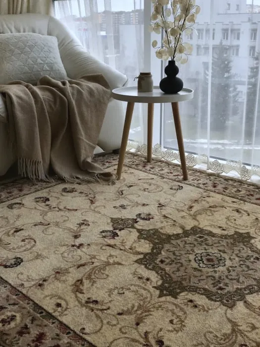 Covorul Lotus 523-100 este o piesă de design clasic, inspirată din stilurile baroc și rococo, prezentând un model cu forme geometrice și o combinație de culori bej și maro.